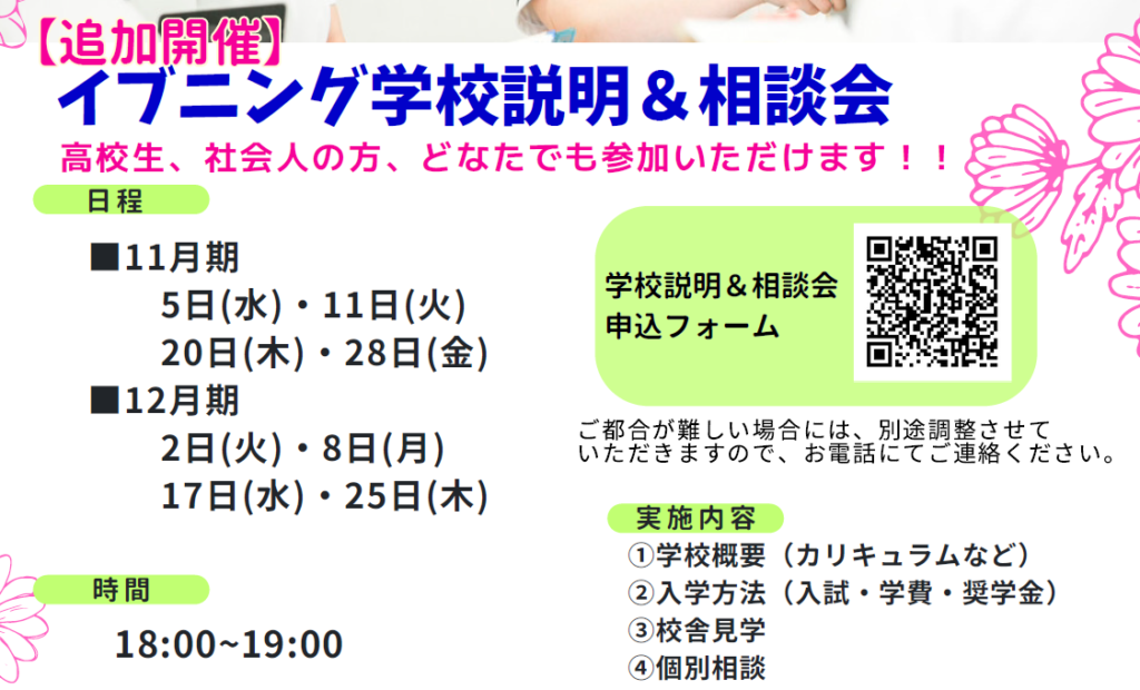 今回の「イブニング学校説明&相談会」は、高校生、社会人の方どなたでもご参加いただけます。